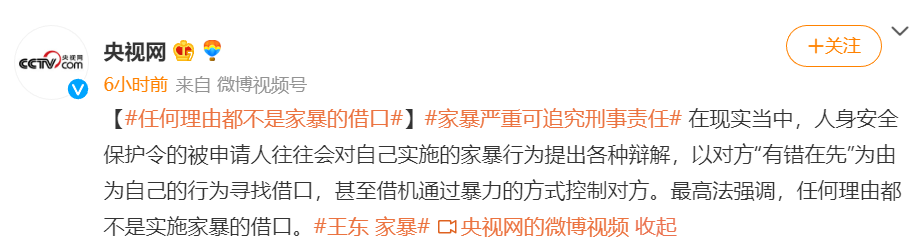 央视网就此事发声:“任何理由都不是实施家暴的借口。”