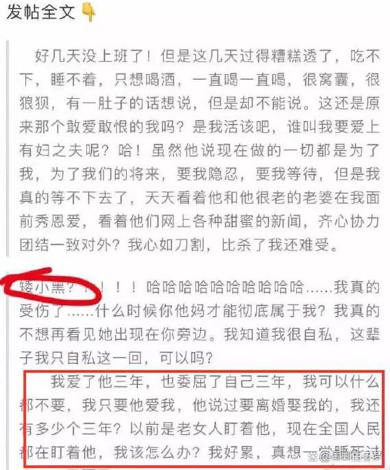 当时被网友当锤的一个证据,是疑似毕滢的天涯 ID 为 " 静静看着你和她 ",里面以第一视角记录了 " 我 " 爱上了一个有妇之夫。比如说委屈了自己三年,一直忍受他和他老婆在自己面前秀恩爱;这个男人说过会离婚娶自己的,要她为了未来忍耐;以前是老女人盯着这个男人,现在是全国人民盯着他 … 而大家锁定毕滢的依据,是因为她对 " 矮小黑 " 这个词特别介意。这个词最开始出现,是张丹峰在采访里为了证明自己和毕滢毫无暧昧,用来吐槽毕滢的。转头 " 静静看着你和她 " 这个账号就开始针对这个词发疯,还顺便辱骂洪欣,说她是丑八怪、老女人、褶子夹死蚊子 ……