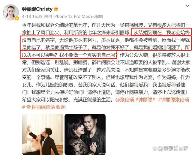 言语间还提到了 " 单身妈妈 " 等字眼,一时间所有人都在传 " 钟丽缇张伦硕感情破裂,钟丽缇独自养娃泪洒直播间 "。
