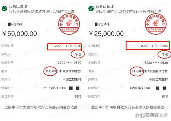 可这位他口中已经辞职的经纪人,到了 2025 年 11 月还在处理张丹峰的工作,张丹峰的直播报酬直接打到了毕滢的账户。