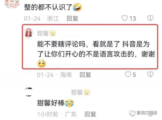 有网友说:整得都不认识了。可爱的甜馨回复说:能不要瞎评论吗,看就是了抖音是为了让你们开心不是语言攻击的,谢谢。