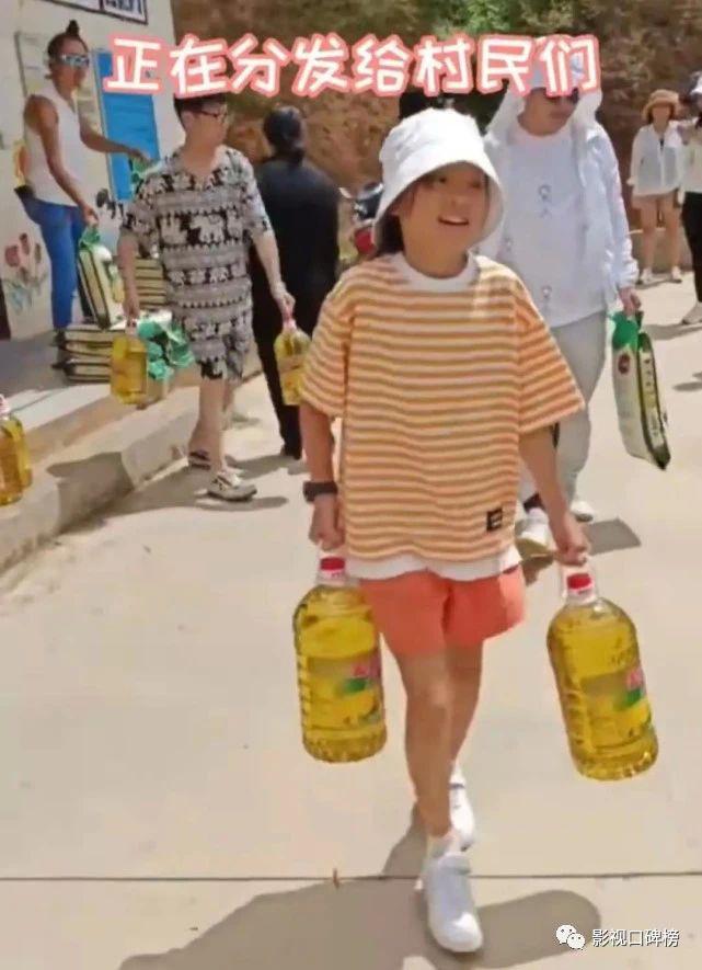 甜馨渐渐长大了,李小璐开始带她去做一些有意义的事情,接触不同的人群。在去年 8 月李小璐带着 9 岁的甜馨下乡做义工,给小朋友买零食、分享零食。让人惊呆了,她一手提一桶油,妥妥的女汉子。难得可贵的是,生长在优越家庭环境的甜馨,一点也不排斥比她生活环境要低的小朋友,还愿意和他们打成一片。在妈妈的引导下,甜馨释放出正能量。