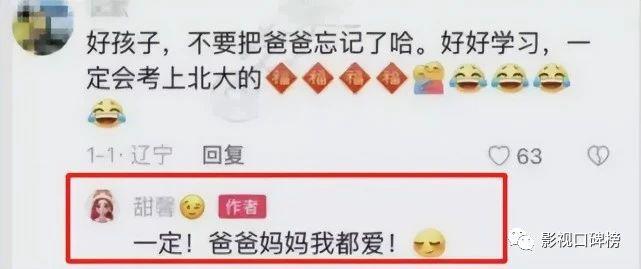 甜馨曾经也是很大方的回复,在评论区是特意提醒说:好孩子,不要把爸爸忘记了哈,好好学习,一定会考上北大的。甜馨回复说:一定,爸爸妈妈我都爱。从甜馨回复的内容看,暴露了她的修养,懂得尊重人顾及别人的感受。
