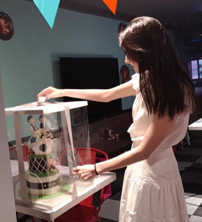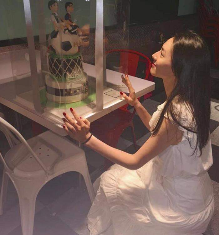 当天梁洛施身穿白色长裙,将头发自然披散,因是双胞胎儿子的生日,所以梁洛施并未施粉黛抢风头。而是深情凝望印有双胞胎兄弟二人样子的蛋糕,梁洛施低下身子蹲着看三层庆生蛋糕,目光中充满母爱。这个蛋糕像是梁洛施找人专门为双胞胎定制,最上层印的是两个男孩一起坐在足球上面,意外透露出梁洛施双胞胎儿子平日喜欢踢足球的爱好。