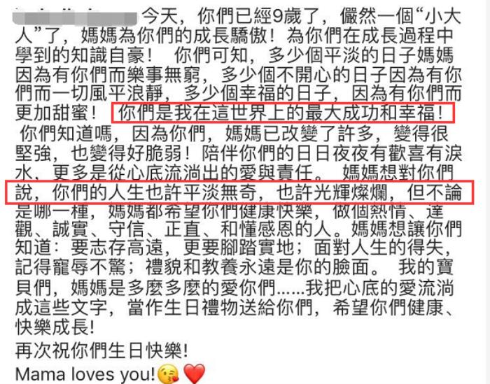 梁洛施还说了一句话:也许儿子们未来的人生会平淡无奇,也许会光辉灿烂,但无论是哪一种对她而言她都希望儿子们能够健康快乐,做个热情懂得感恩的人。纵观梁洛施长达百字的真情流露来看,其实她内心应该是很苦闷的。