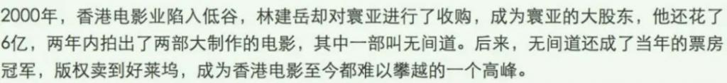 之后林建岳转移至娱乐产业,入股亚洲最大的电影制作公司寰亚电影公司成为大股东,投资出品的《无间道》开启了香港警匪题材电影的新纪元,也让寰亚跻身一流的制作公司。