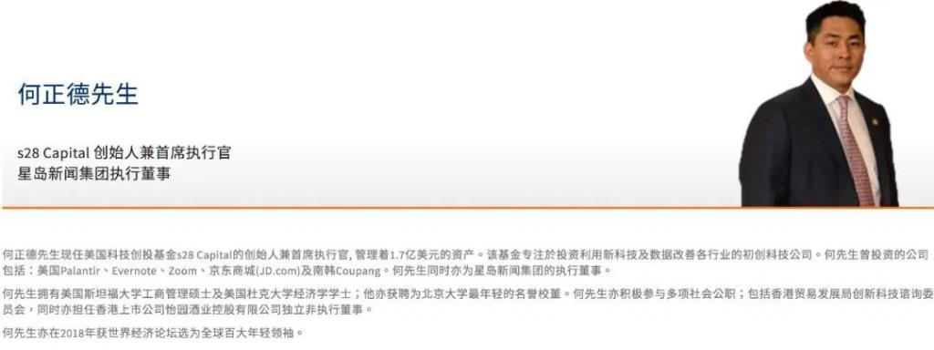 持有美国杜克大学经济学学位,美国斯坦福大学工商管理硕士学位,目前是美国科技创投基金S28 Capital的创始人兼首席执行官。