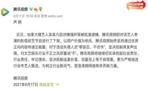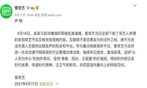 要知道的是,吴亦凡曾经是顶流的明星,所参演的视频可谓是多到数不清。对于如今他所犯下的错误,多家视频平台在8月17日发声明,表示已经下架了有关吴亦凡的所有影视综艺作品。而且也是对于原则问题阐述的一清二楚,立场摆的非常明确。