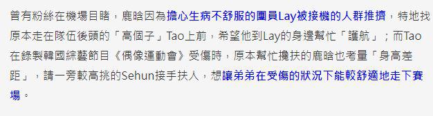 " 鹿晗因为担心生病不舒服的团员 Lay(张艺兴)被接机的人群推挤,特地找到原本走在队伍后头的‘高个子’ Tao(黄子韬)上前希望他帮忙护航 "……