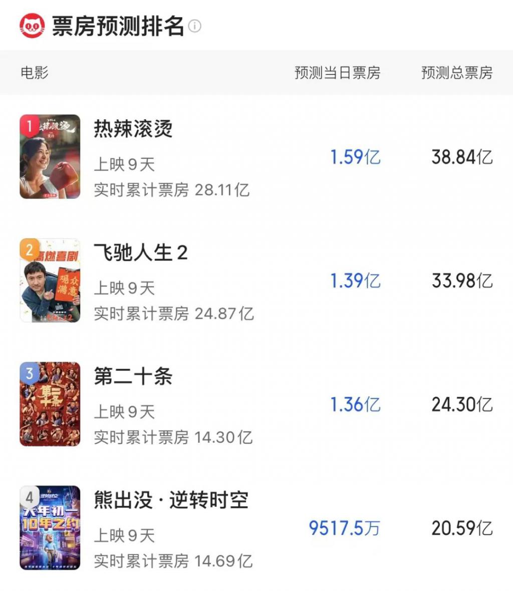 而档期内的几部影片后劲也相对有限。据猫眼 AI 预测票房,截至毒眸发稿前《热辣滚烫》已经跌至 40 亿以下,最终与《飞驰人生 2》预计将以 " 双 30 亿 +" 收官,比去年高至 " 双 40 亿 +" 的《满江红》和《流浪地球 2》相比,长尾效应更加逊色。