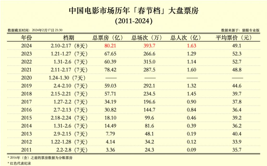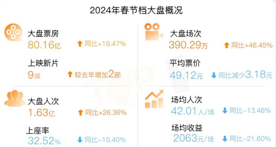 80.16 亿,春节档的票房数字来到了全新的高度。有赖于 8 天的档期容量,票房、场次、人次均创新高,在平均票价下滑的前提下,取得这样的成绩值得兴奋。