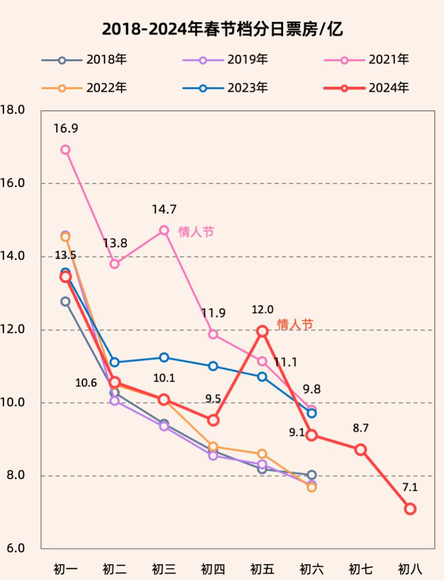 票房再创新高的原因,除了档期时间更长之外,也和嵌套了情人节有关。大年初五情人节当天,大盘收 11.92 亿票房,比前一天逆跌达 3 亿,仅次于大年初一,也是档期内的唯一一次逆跌。成绩非凡的 2025 年春节档,同样有情人节档加持。