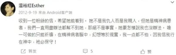 2011 年,温裕红宣布和圈外男友闪婚,说自己很感恩遇到了命定的好伴侣。