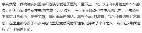 在长文里描述了自己得知患有严重 HPV 的崩溃,因为她已经接种了目前市面上最高价的 HPV 疫苗,所以疫苗也没防住这件事多少还是有点难以接受吧 ……