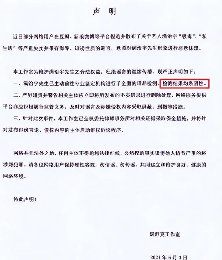 随后,满舒克的工作室还出了声明,表示做全面的毒品检测,结果均系阴性