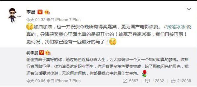 在第 53 届金 · 马奖上,被寄予厚望的范冰冰遗憾落选。李晨暖心发博安慰,说道 " 无论何时何地,你都是我心中的最佳女主角 "。