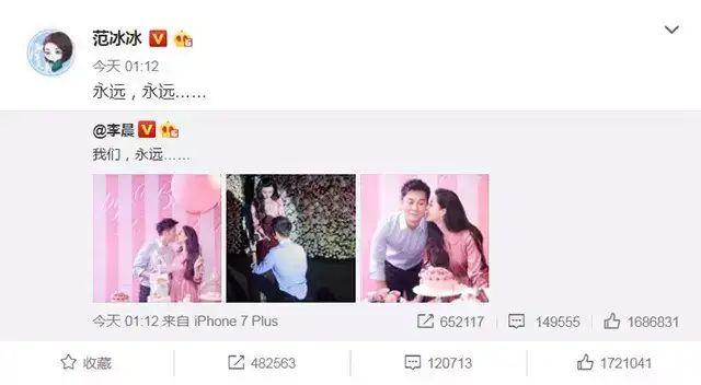 凌晨,李晨在微博上晒出求婚照片,配文 " 我们,永远 ……",随后范冰冰转发微博,写下 " 永远,永远 ……"。