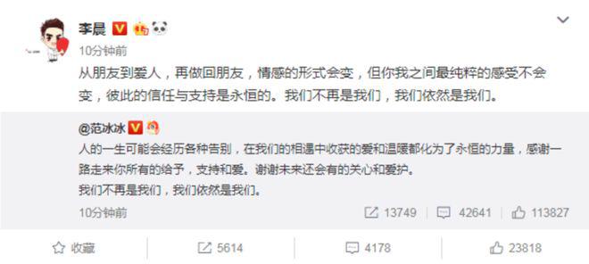 2015 年,李晨在微博分享了一张与范冰冰的合影,并配上文字 " 我们 ",范冰冰也用同样的 " 我们 " 二字转发了这条微博,正式公开了他们的恋情。