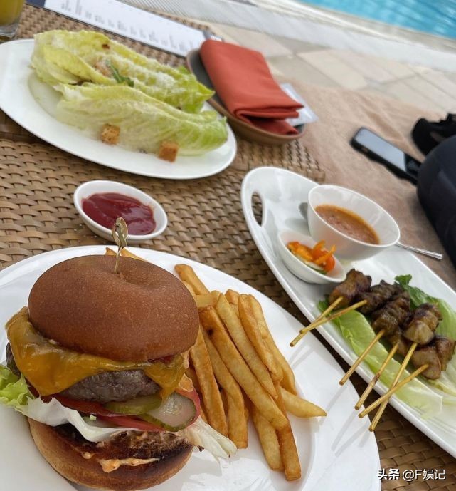 除了在泳池游泳、晒太阳外,他们夫妻俩还可以享受美食,两人的二人世界过得很舒服。