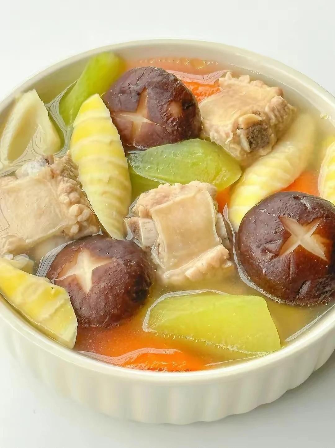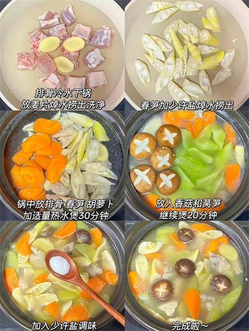 做法:排骨焯水捞出,春笋加少许盐焯水捞出,放入排骨,春笋,红萝卜煮三十分钟。