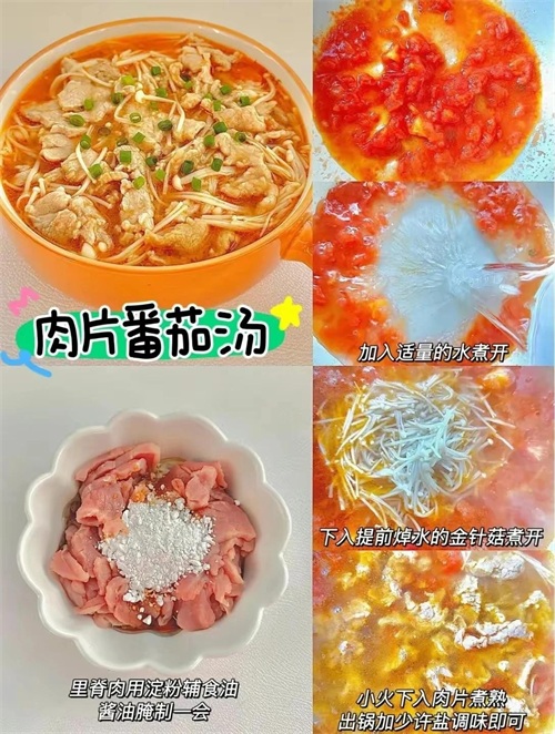 番茄碎炒熟,放开水再放入焯过水的金针菇煮开,放入肉片,最后放盐调味。