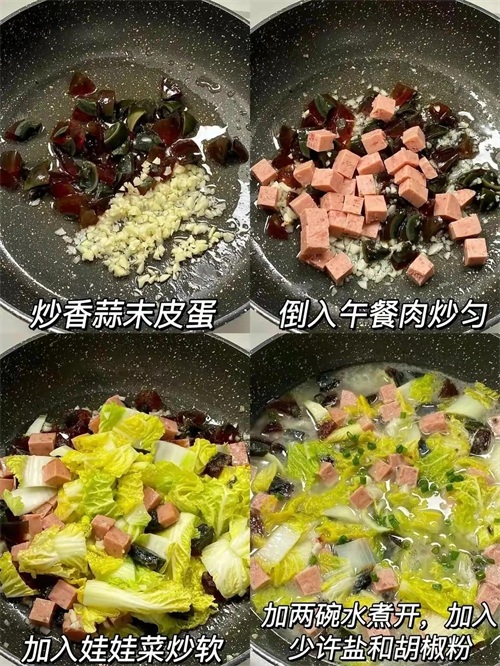 做法:炒香蒜末,皮蛋,倒入午餐肉炒均匀,加入娃娃菜炒软,倒入水,放盐和胡椒粉。