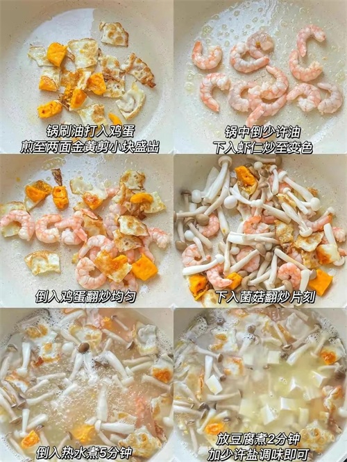 做法:蛋和虾煎熟,放入菌菇翻炒,倒入热水煮5分钟,加豆腐煮2分钟,放盐。