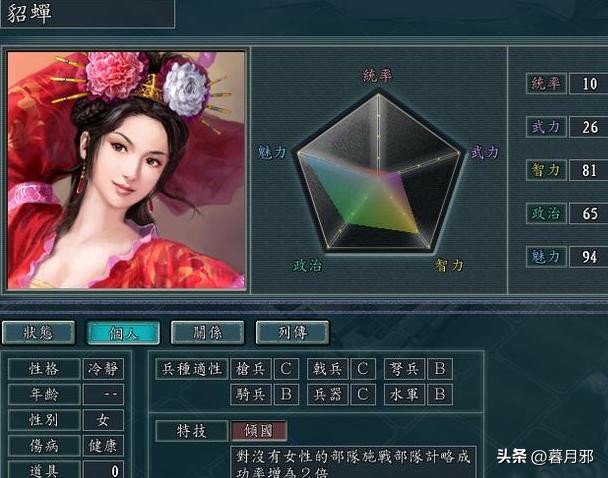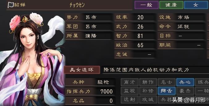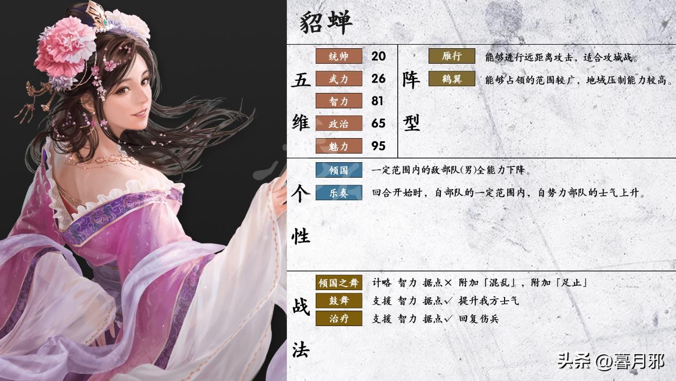 个人感觉,三国志11貂蝉的立绘是做得最好的一代,美艳动人,这个才是绝色美女的感觉。特技倾国,对没有女性武将的部队施展计略成功率增加2倍,在女将稀少的三国志里是非常实用的。