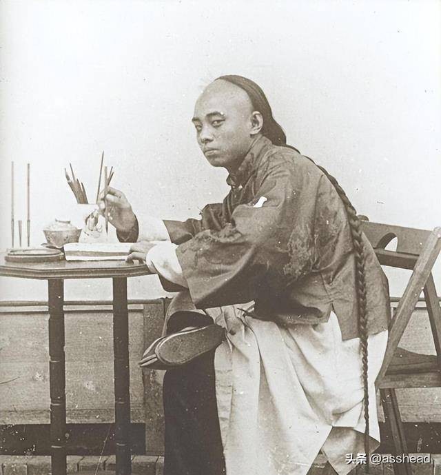32、男子手持毛笔,翘着二郎腿,这不是写字的正确姿势