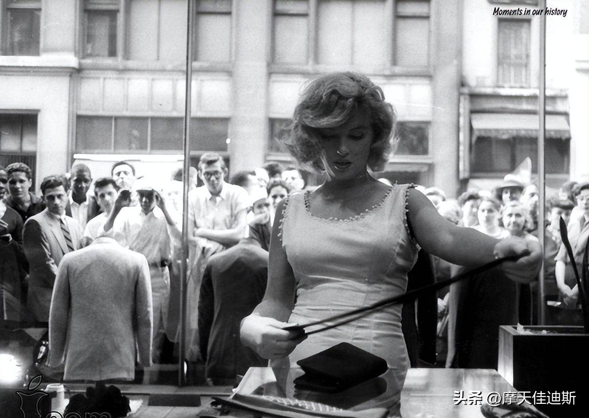 14、1957年的玛丽莲梦露在购物时,外面站满了粉丝。