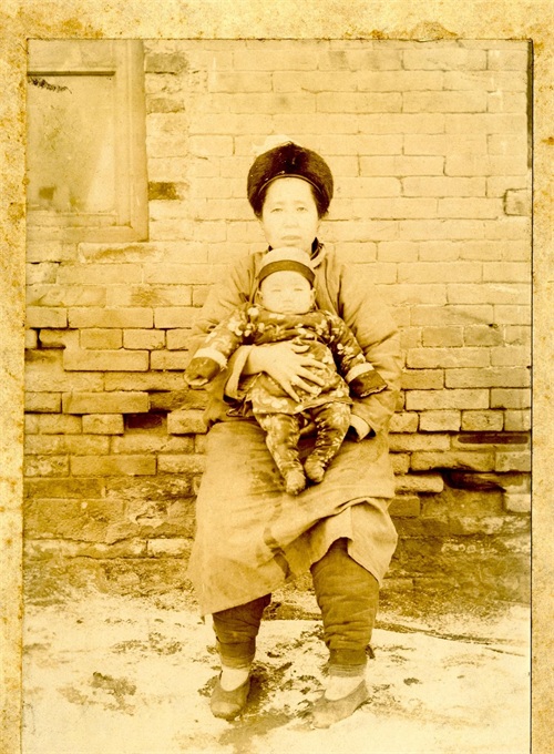 19、清末,抱孩子的满人妇女。坐姿形象都周正。就是娃尿了。