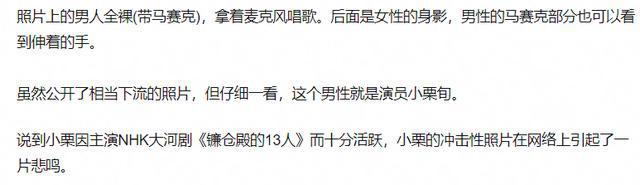 照片中小栗旬正在赤身唱着歌,疑似有一双手还伸向重要部位,背后还有一枚女子正在整理衣物,包括拍照的人,现场至少有三个人。而小栗旬本人竟然看着习以为常。