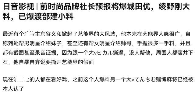 同时东谷还针对和小栗旬有过多次合作的男星城田优,爆料了他诈骗涉黑等事。