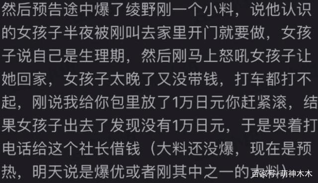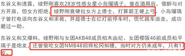 东谷最开始的爆料对象就是和小栗旬同公司的男星绫野刚,又说他深夜叫女生回家,发现对方生理期后就恶语相向,连打车费都不给就赶人离开,又说他对未成年女团成员下手,还试图对女星霸王硬上弓。
