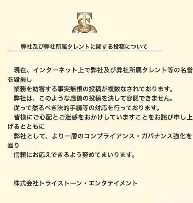 咱也不知道东谷最初 " 良心 " 发现的原因是什么,他自述是因为被身边朋友落井下石,但是从他后续爆料看,他似乎和小栗旬、绫野刚、田中圭等知名男星所在公司 Tristone 娱乐有着深切矛盾,Tristone 娱乐 6 月中旬的时候还发了一个不痛不痒的声明,却连东谷的名字都没敢提。