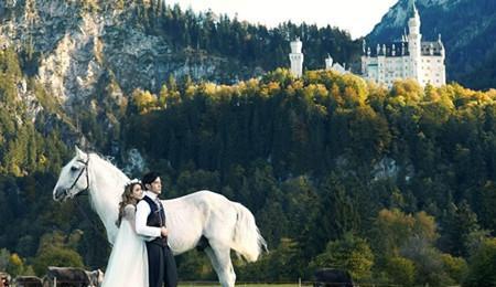 刚升级做爸爸的Jay当初结婚的时候可谓是声势浩大,圆了昆凌的公主梦,他们的婚纱照走的也是浪漫唯美风,在城堡和蓝天下的草地,牵着一匹白马,Jay穿着西装,昆凌一袭白纱,美得像一幅油画,而在城堡的高处亲吻妻子也是非常有大片感,黑白的色调让整个婚纱照更显高级。