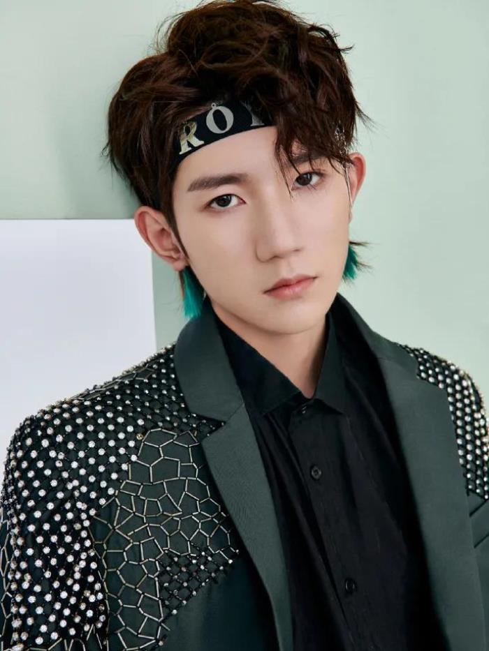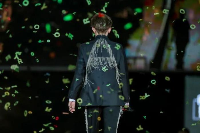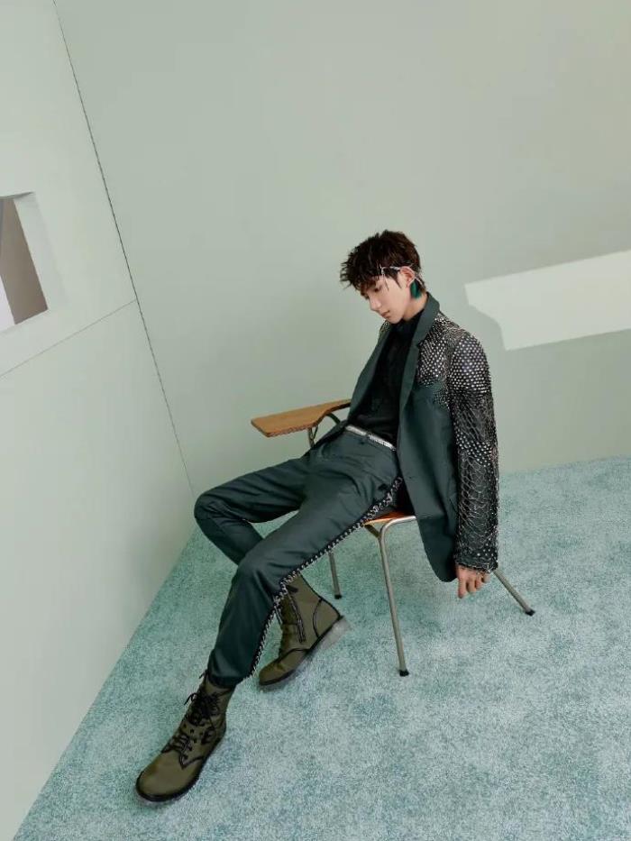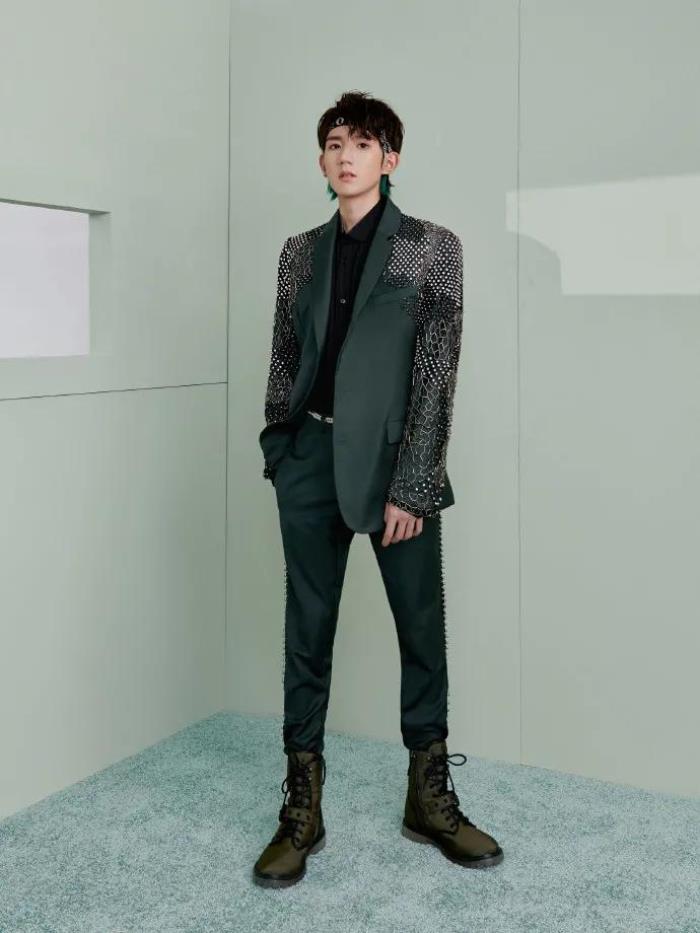 水晶铆钉展露自信少年的成熟力量,几何镂空金属映照对未来的憧憬与向往,肩部的亮片与银饰衬托出少年的干净与清新,王源就是那在舞台上安静纯洁的暗绿精灵。