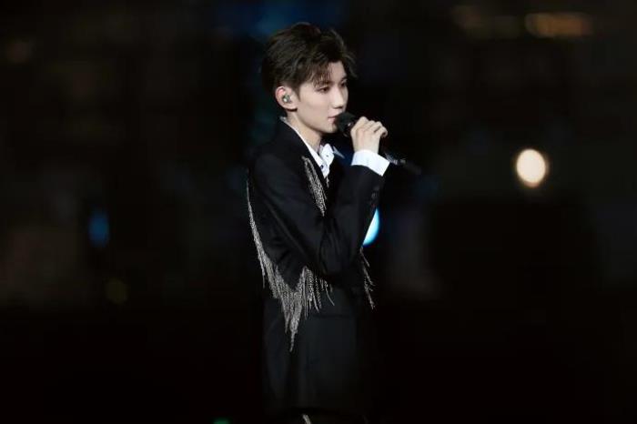 王源身穿金属链条装饰西装,内搭铆钉衬衫,是舞台上最闪耀的存在,淡淡烟熏妆配上全黑造型的摇滚形象是少年成熟酷炫的又一次进阶。