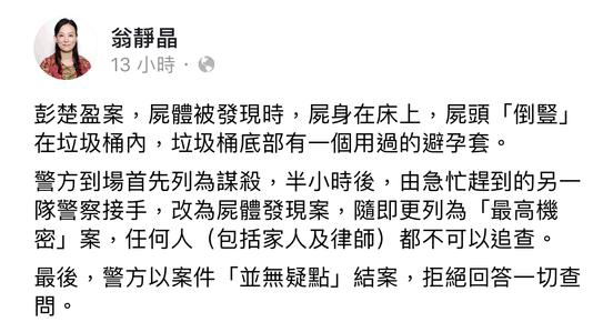 面对诸多根本无法解释的疑点,法庭仍然宣布,排除他杀和自杀的可能,彭楚盈生前患有癫痫,死亡纯属意外。