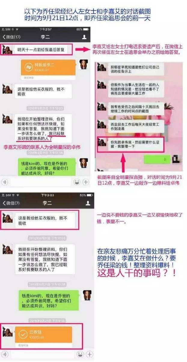 但是后才得知原来在乔任梁去世的第二天,她的女友李嘉艾竟跑过来跟他的父母索要遗产,后来他还威胁他的父母如果拿不到钱的话说,就曝光乔任梁生前的黑料,他的女友竟还拿着乔任梁的手机给自己转了几笔钱。