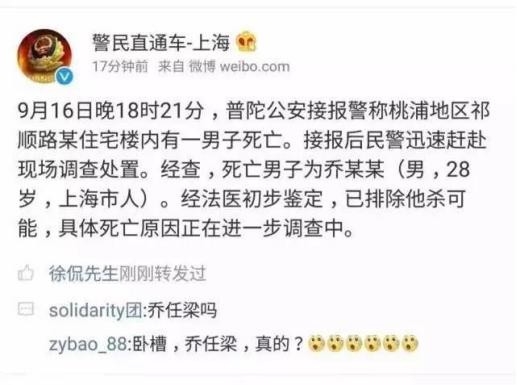 而乔任梁也是其中一位,2016年9月一则微博引起了大家的视线,一位乔某某的男性在室内死亡,年仅28岁。