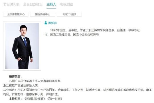 苏州广播电视总台官网资料显示:黄新琦1992年出生,金牛座,毕业于浙江传媒学院播音系,获得普通话一级甲等证书、国家二级播音员、国家中级礼仪师称号,还曾获得苏州广电总台华语主持人大赛最具风采奖、浙江省推广普通话形象大使。