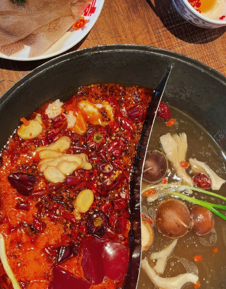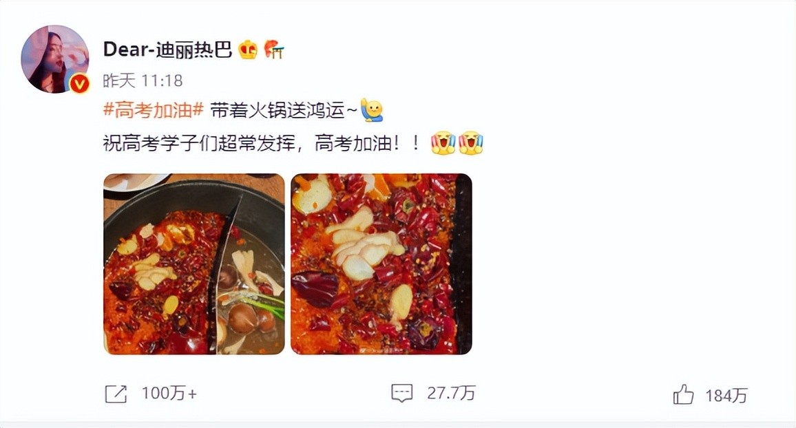 不得不说,迪丽热巴真的是够调皮的,人家不是晒美照就是手写祝福语,她居然晒出了两锅鸳鸯锅出来。