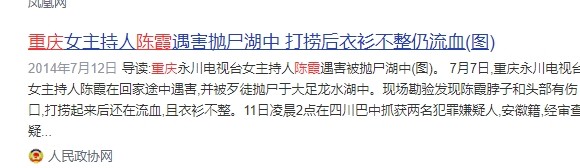 1、重庆女主持人陈霞遇害抛尸湖中 打捞后衣衫不整仍流血(图)——人民政协网2014年7月12日