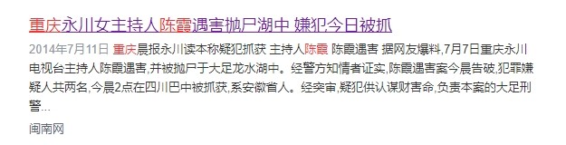 2、重庆永川女主持人陈霞遇害抛尸湖中 嫌犯今日被抓——闽南网2014年7月11日