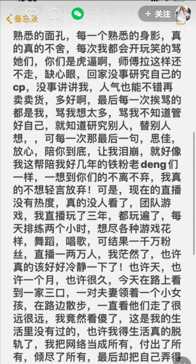 每一张熟悉的面孔,每一个熟悉的身影,真的真的不舍,每次我都会开玩笑的骂她们,你们是虎逼啊,师傅拉这样还不走,缺心眼,回家没事研究自己的cp,没事讲讲我,人气也能不错再卖卖货,多好啊,最后每一-次挨骂的都是我,骂我想太多,骂我不知道管好自己,就知道研究别人,替别人想,,可每一-次那最后- -句,思佳,放心,陪你到底,让我泪崩,就好像我这帮陪我好几年的铁粉老deng们-样,-想到你们的不离不弃,我真的不想轻言放弃!可是,现在的直播没有热度,真的没人看了,团队游戏,我直播玩了三年,都玩遍了,每天排练两个小时,想尽各种游戏花样,舞蹈,唱歌,可结果一千万粉丝,直播- -两万人,我茫然了,也许真的该好好冷静一-下了!也许天,也许-一个月,也许很久,今天在路上看到一家三口,一-对夫妻领着一个小女孩,在路边散步,一直看他们走了很远很远,我竟然看傻了,这是我的生活里没有过的,也许我得生活真的脱轨了,我把网络当成所有,付出了所有,倾尽了所有,最后却把自己弄得