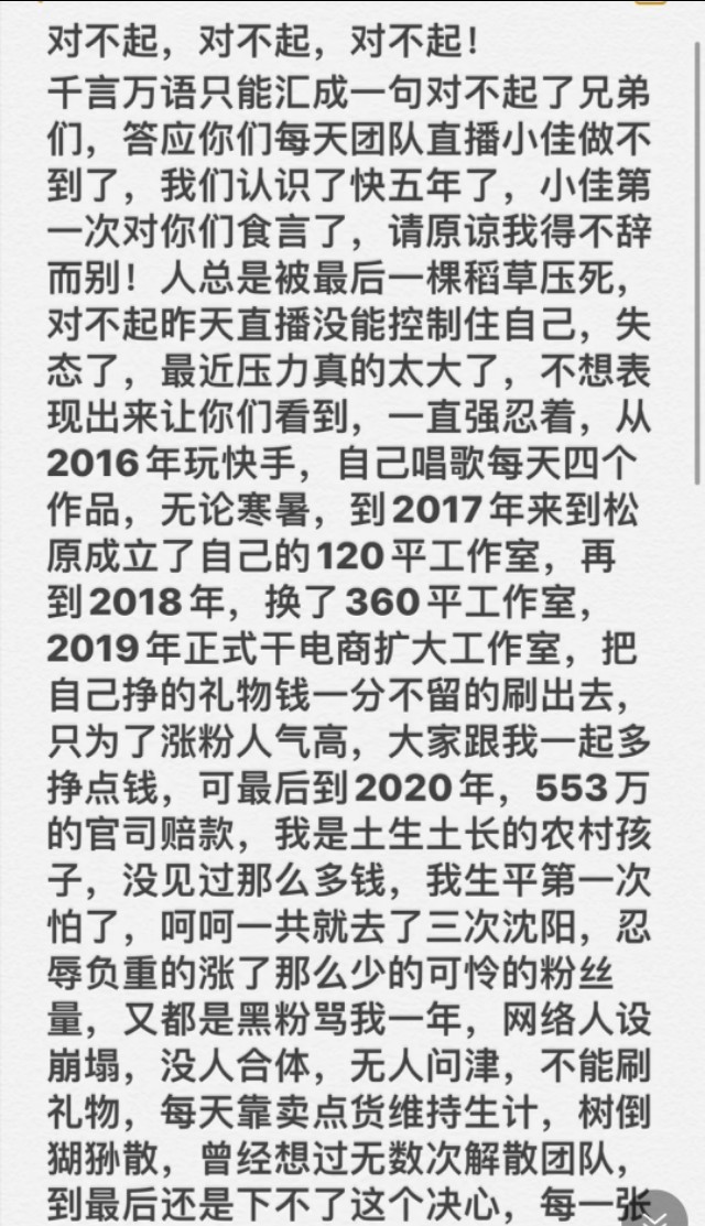 千言万语只能汇成一句对不起了兄弟们,答应你们每天团队直播小佳做不到了,我们认识了快五年了,小佳第- -次对你们食言了,请原谅我得不辞而别!人总是被最后一棵稻草压死,对不起昨天直播没能控制住自己,失态了,最近压力真的太大了,不想表现出来让你们看到,一直强忍着,从2016年玩快手,自己唱歌每天四个作品,无论寒暑,到2017年来到松原成立了自己的120平工作室,再到2018年,换了360平工作室,2019年正式干电商扩大工作室,把自己挣的礼物钱一分不留的刷出去,只为了涨粉人气高,大家跟我一起多;挣点钱,可最后到2020年, 553万的官司赔款,我是土生土长的农村孩子,没见过那么多钱,我生平第- -次怕了,呵呵一共就去了三次沈阳,忍辱负重的涨了那么少的可怜的粉丝量,又都是黑粉骂我一年,网络人设崩塌,没人合体,无人问津,不能刷礼物,每天靠卖点货维持生计,树倒猢狲散,曾经想过无数次解散团队,到最后还是下不了这个决心,