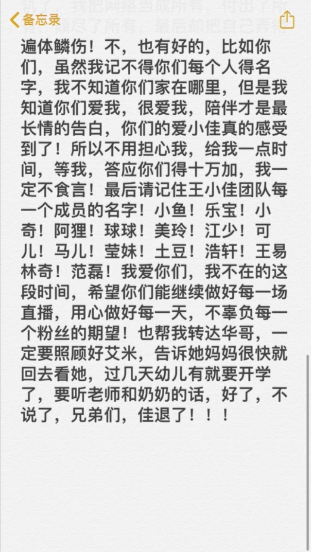 遍体鳞伤!不,也有好的,比如你们,虽然我记不得你们每个人得名字,我不知道你们家在哪里,但是我知道你们爱我,很爱我,陪伴才是最长情的告白,你们的爱小佳真的感受到了!所以不用担心我,给我一-点时间,等我,答应你们得十万加,我一定不食言!最后请记住王小佳团队每一个成员的名字!小鱼!乐宝!小奇!阿狸!球球!美玲!江少!可儿!马儿!莹妹!土豆!浩轩!王易林奇!范磊!我爱你们,我不在的这段时间,希望你们能继续做好每一场直播,用心做好每一天,不辜负每一个粉丝的期望!也帮我转达华哥,一定要照顾好艾米,告诉她妈妈很快就回去看她,过几天幼儿有就要开学了,要听老师和奶奶的话, 好了,不说了,兄弟们,佳退了! ! !