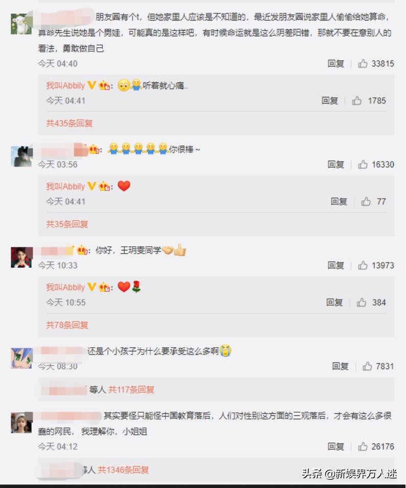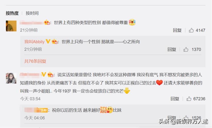 对于艾比敞开心扉,网友基本上都是支持和祝福的态度,虽然像艾比这样的人是少数,但值得被尊重,可以发现如今的网络环境对于艾比的宽容度较高。