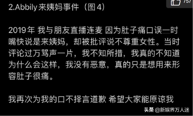 第2件事发生在2019年,艾比在一次连麦中表示自己来了大姨妈,当时很多主播听到艾比言论时大为震惊,网友也极尽嘲讽之能事,纷纷讽刺艾比不尊重女性。